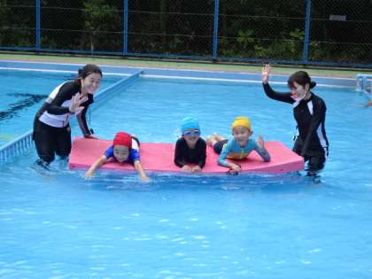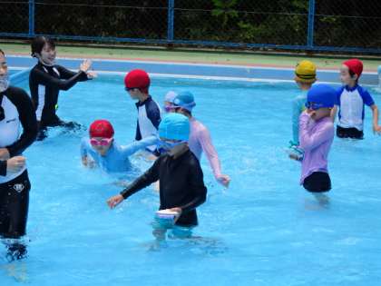1・2年生が、今日も楽しく水泳学習をしました。プールの底の宝物を拾ったり、ジャンボビート板に乗ったり、ずいぶん水に慣れてきました。