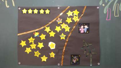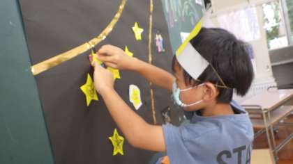 みんなで作った星を使って、「あまのがわをつくろう 〜ほしさがしたんけん〜」をしました。4人ずつのチームに分かれ、かくしチームが星を教室にかくし、見つけチームが星を見つけて、大きな天の川に星をはっていきます。最後には、素敵な天の川ができあがりました。