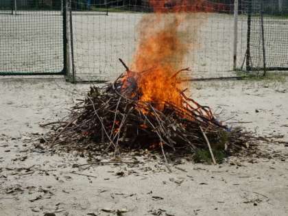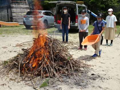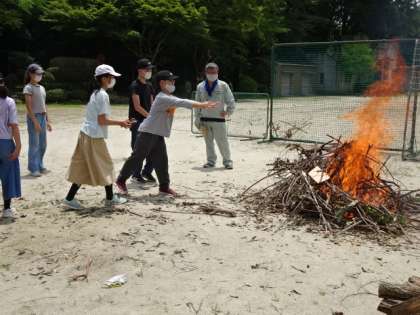 木の枝を組むことができたら、次に落ち葉を入れました。炎があがり、木の枝が大きく燃えだしました。この木の枝が燃えたら、土器ができあがります。できあがりが楽しみです。
