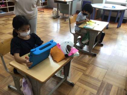 松平交流館祭の「きぼうのひかりプロジェクト」で、学校で一つのペットボトルツリーを作ります。そのツリーになるペットボトルに、絵を描きました。どう描いたらいいかわからないときは、学習用タブレットで描き方を調べていました。テーマは「希望、夢、未来へ」です。どんなツリーができあがるか、楽しみです。