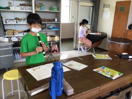 リコーダーの曲集「ふえのひびき」の中から先生が3曲選び、今度は子どもたちがその中から、自分が演奏したい曲を1曲選びました。感染対策として、友達と距離をとりながら、自分で選んだ曲を、頑張って練習しました。
