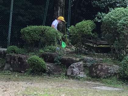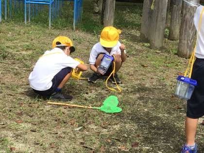 5日に行った生き物探しの出前授業で、講師の方に教えていただいたことを生かして、今日は自分たちで虫取りをしました。子どもたちは、次々といろいろなバッタを捕まえて、うれしそうに友達や先生に見せていました。捕まえたバッタは、授業が終わると、自然にかえしていました。