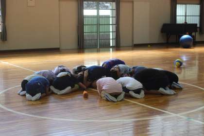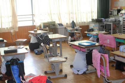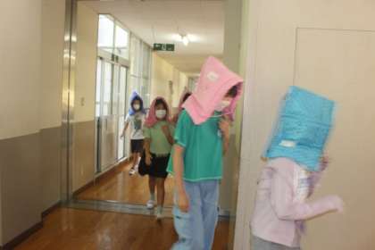 休み時間に地震が発生したことを想定して、避難訓練を行いました。子どもたちには、今日訓練を行うことだけ伝えてありました。2時間目が終わった5分後、訓練開始です。教室にいた子たちは、机の下にもぐり、体育館にいた子たちは、中央に集まり、姿勢を低くしてじっとしていました。みんな落ち着いて行動し、避難することができました。