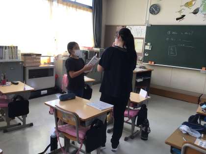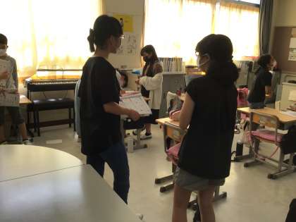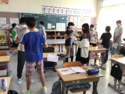 5年生が、外国語科の学習で、友達に家族の紹介をしていました。「Who is this?」「This is 〜 . He(She) can 〜 .」と、会話を楽しんでいました。