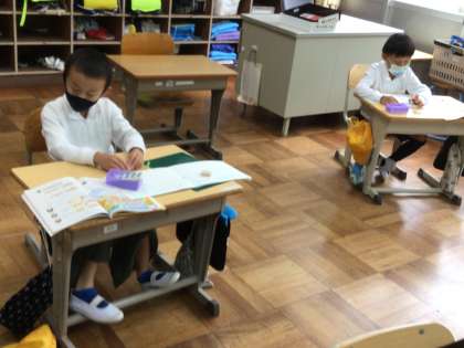1年生が、算数で「くり上がりのあるたし算」の学習をしました。数図ブロックを使って計算の仕方を考え、友達に伝えました。最後の振り返りでは、授業の初めと終わりで自分の考えがどうかわったのか、発表していました。
