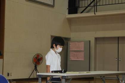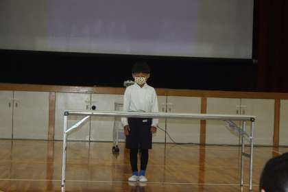 はじめに、1年生と3年生の代表スピーチがありました。前期にがんばったこと、後期に頑張りたいことを話しました。「漢字をがんばって覚えたい」「グループでの話し合いをがんばりたい」と、一言一言を大切にして伝えていました。