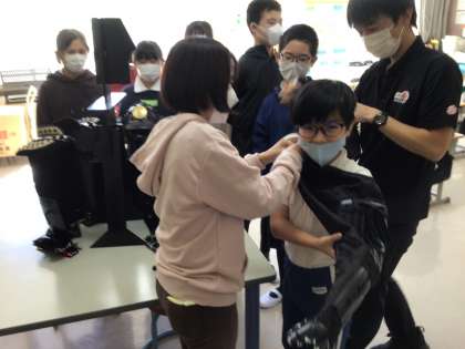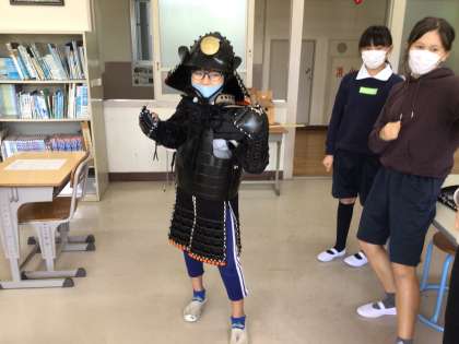 なかよしタイムに、実際に鎧を身につけて、その重さや着心地などを体験しました。武将になった子どもたち、かっこいいです。