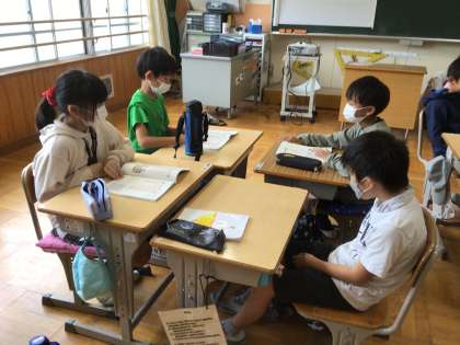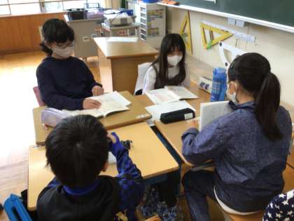 3・4年 国語の学習 公開日 2022/10/12 更新日 2022/10/12 各学年から 3・4年生が、国語の授業で、話し合いの進め方の学習をしていました。教科書の話し合いのモデル文をもとに、司会の進行にそってグループで話し合いを進めていました。