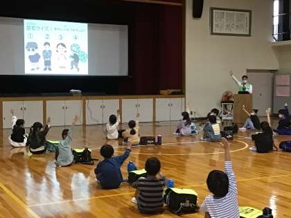 防犯教室1 公開日 2022/10/13 更新日 2022/10/13 学校行事 豊田市交通安全防犯課の方4名を講師に迎え、1〜4年生を対象に、子ども防犯教室を行いました。はじめに、防犯基礎学習として、不審者とはどんな人か、クイズをしながら考えました。また、不審者にあったときの対応の仕方を、「つみきおに」の合言葉とともに学習しました。