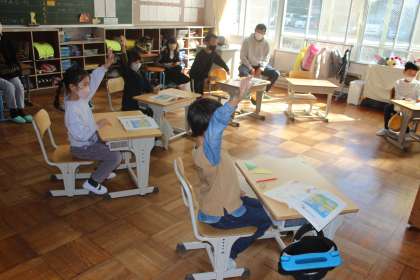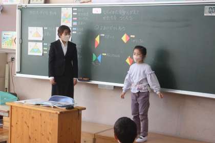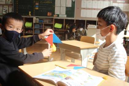1年生は、算数の授業で、かたちづくりの学習をしました。三角形の色板を2枚組み合わせて、どんな形ができるか考えていきました。