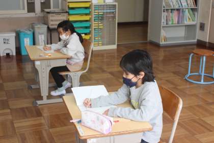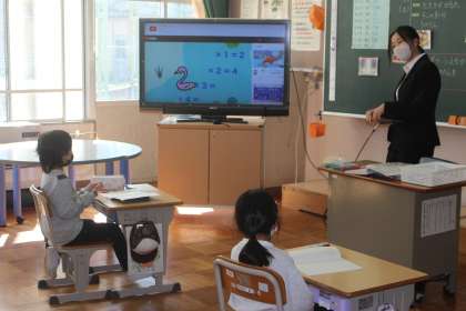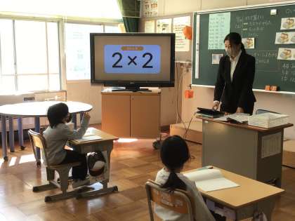 2年生は、算数の授業で、かけ算の学習をしました。いくつずつふえるかを考えて、2の段をつくりました。電子黒板を使って、2の段の九九の練習もしました。