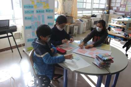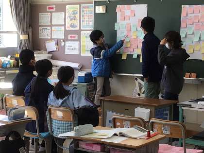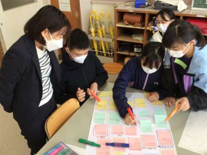 6年生は、国語の授業で、「町の幸福論」の学習をしました。松平のよさと課題、未来の姿について事前に付箋に書いておき、今日はそれをもとにグループで一人一人が考えたことを伝え合い、仲間分けをしました。そして、もう一つのグループに発表しました。地域を大切に思う子どもたちの気持ちが伝わってきました。