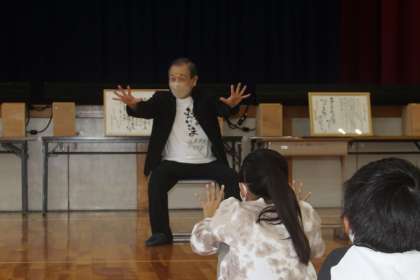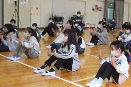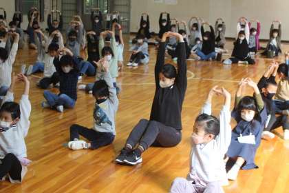 はじめは、座った姿勢で、手をパーにしたり、手を上にあげて体をのばしたりしました。