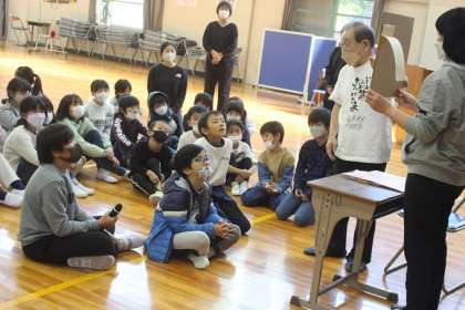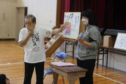 講師の方が書かれた絵と言葉をみんなで見ました。「本当は もう 幸せなんだよ」の言葉で、お話が終わりました。最後に、代表児童がお礼の気持ちを伝えました。