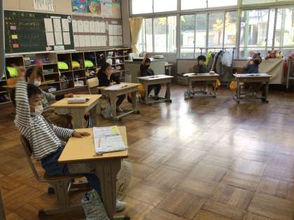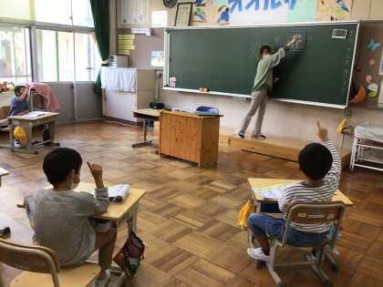 1年生が、国語の授業で、漢字の学習をしていました。「花」を空書きしたり、つくりの「匕」とひらがなの「ヒ」の違いを考えたりしていました。