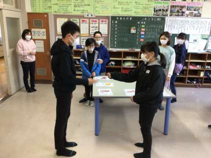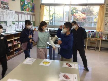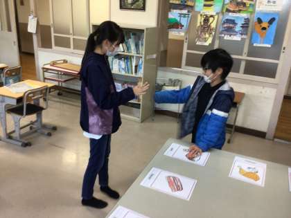 6年生が、外国語科の授業で、ドンじゃんゲームをして、楽しみながら、「egg」「beef」「pork」など、食べ物の名前の言い方を覚えていました。とても盛り上がっていました。