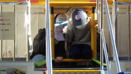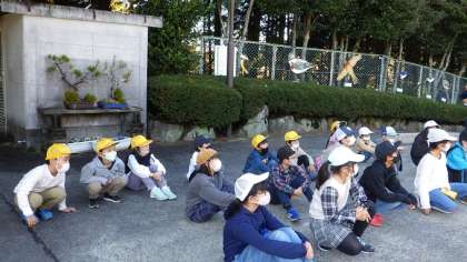 避難訓練で、地震体験車(防サイ君)にのり、震度6強の地震を体験しました。机の脚をしっかり持ち、頭を机の下に入れ、自分の身を守りました。