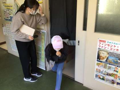 理科室の中にスモークマシンで煙を発生させて、煙道を通る体験をしました。目の前が真っ白だけれど、壁に手をあてながら、わずかな視界をたよりに前に進み、煙から抜け出していました。
