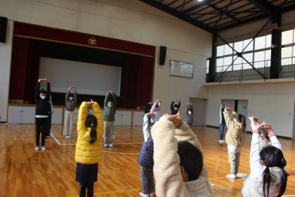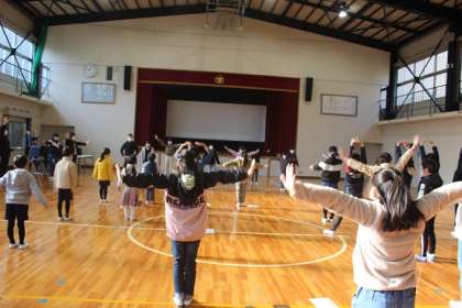 保健委員会が、いきいき集会で、「元気もりもり体操」を全校に紹介しました。この体操は、10月に行った学校保健委員会で山内先生に教えていただいたことを参考に、保健委員会がつくった滝脇オリジナルの体操です。12月12日(月)から、朝の会の後に放送で音楽を流し、全校でこの体操に取り組んでいくことを呼びかけました。体操を覚えるために、みんなで「元気もりもり体操」をやってみました。