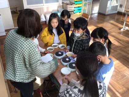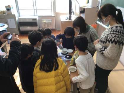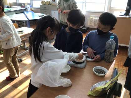 1・2年生が、給餌台に置く餌の準備をしていました。ラッカセイやヒマワリの種、エゴマなどを、はかりで20gずつ量っていきます。2年生が1年生に、はかりの使い方を教えていました。