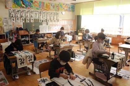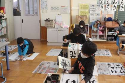 3年生は、毛筆ではじめての書き初め大会でした。「げんき」の三文字を力強く書いていました。4年生は、昨年より一文字増えた「花さく里」を、ていねいに筆を運びながら書いていました。