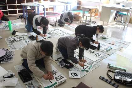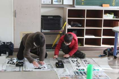 5年生は、机で書きたい子と床で書きたい子とで分かれて、別々の教室でゆとりをもった環境で書き初めに取り組みました。