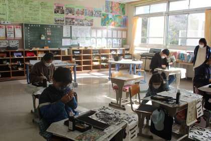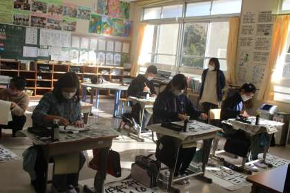 書き初め大会(6年) 公開日 2023/01/10 更新日 2023/01/10 学校行事 6年生は、小学校最後の書き初め大会でした。講師の先生に教えていただいたことをいかして、一筆一筆ていねいに書いていました。気持ちのこもった字が書けました。