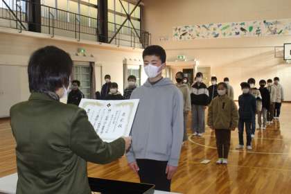 いきいき集会(1月)3 公開日 2023/01/19 更新日 2023/01/19 特別活動 第56回全国野生生物保護活動発表大会において林野庁長官賞をいただいたことで、豊田市教育委員会から表彰状をいただきました。いきいき集会で紹介し、6年生の代表児童に表彰状を渡しました。4年生から6年生には、一人一つずつメダルもいただきました。