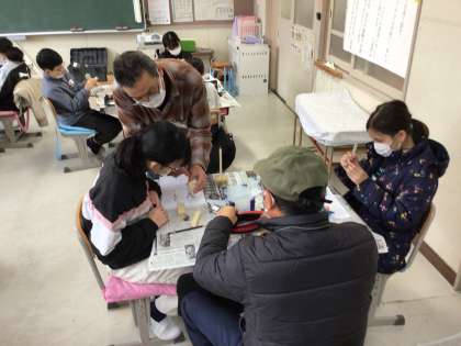 今日は、棒ヤスリで木を削って鳥の体に近づけていったり、鳥の目を彫ったりしました。講師の先生にいただいた絵をもとに目の位置を決めて、くちばしに向かって彫刻刀で彫りました。