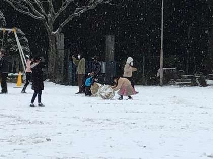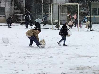 朝から雪が降り続き、「ふれあいタイム」の運動場には、午前中よりもさらに雪が積もっていました。子どもたちは、雪合戦をしたり、大きな雪玉を作ったりして、楽しんでいました。