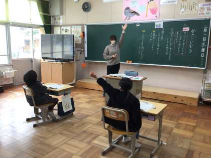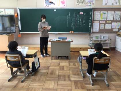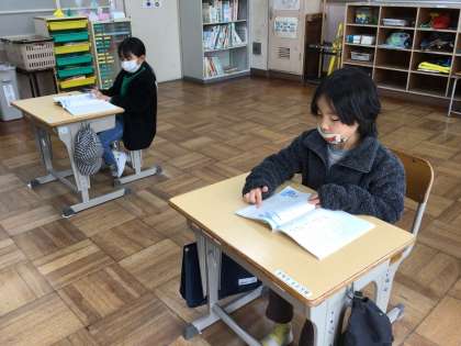 2年生が、国語の授業で、「かさこじぞう」の読み取りをしています。はじめに、読んでいるところを指でなぞりながら一人で静かに読んでいました。教室がシーンと静まり返っていました。次に、二人で丸読みをしました。句点(。)で交代しながら、すらすら読み進めていました。しっかりお話を読んで、じさまの様子や気持ちを考えました。