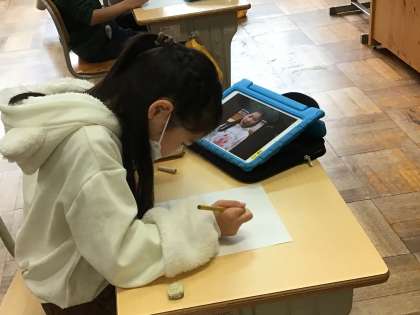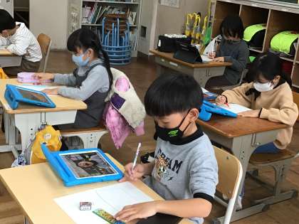 先週ジブリパークに行き、広々とした芝生広場でお弁当を食べたことが、子どもたちにはとても楽しい思い出となったようです。そこで、図工の時間に、お弁当と自分の似顔絵を描きました。学習用タブレットで友達に写真を撮ってもらい、それを見ながら似顔絵を描いていきました。