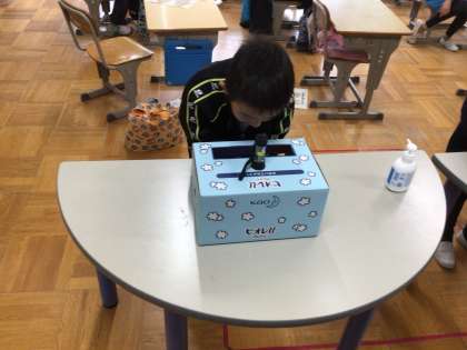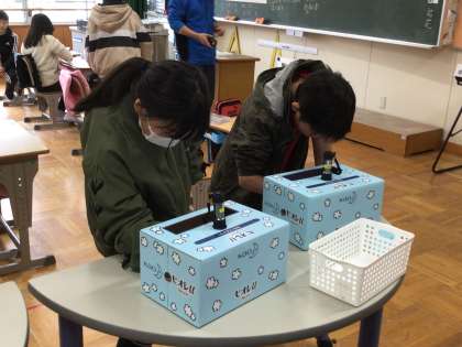 専用のローションを塗った手を特殊ライトの光にあてると、ローションを塗ったところがきれいに光っていました。しっかりと塗ったので、手全体が汚れている状態になりました。子どもたちは、その汚れ具合にびっくりしていました。