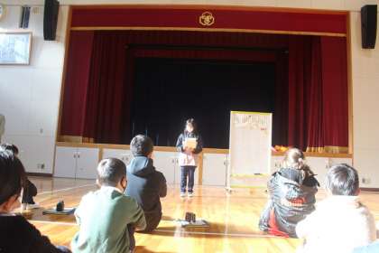 今日のスピーチ集会の発表者は、3年生です。趣味(すきなこと)について発表しました。質問もいろいろ出ました。