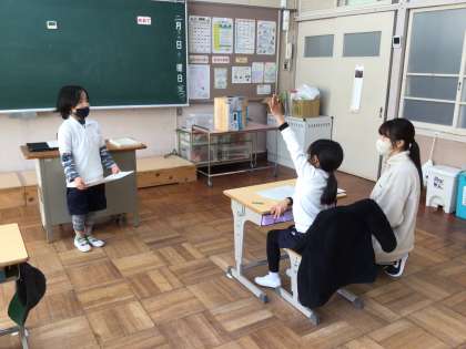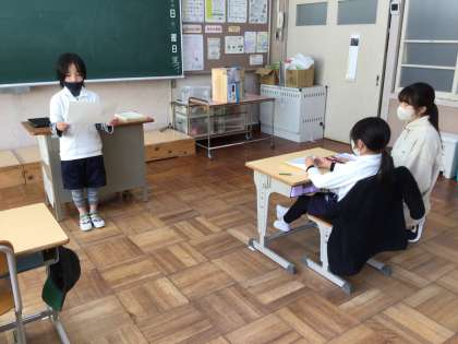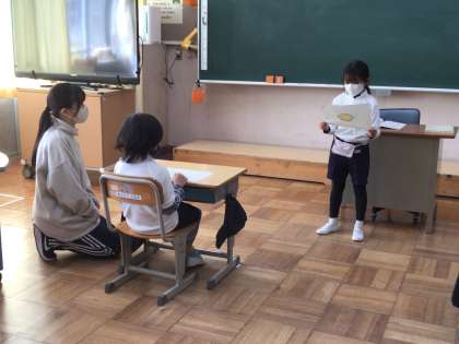 2年生が、国語の授業で、「この 人を しょうかいします」の学習をしています。今日は、それぞれが書いた紹介文を読み合いました。「はじめ」「中」「おわり」の構成で書かれていて、とてもわかりやすい紹介文でした。紹介した人のことがとても大好きだということが、聞いている人に伝わってきました。また、質問タイムもあり、紹介した人のことがよくわかりました。
