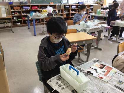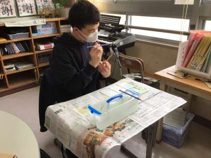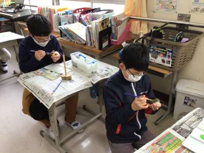 5・6年生が、バードカービングにさらに色を重ね、完成させました。今日は講師の方やボランティアの方の力を借りず、自分たちで頑張りました。完成した5年生は、6年生を送る会の準備をしました。