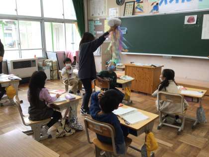 今日の国語のめあては、「スイミーが見つけた『すばらしいもの』をそうぞうしよう」です。子どもたちが、くらげ、いせえび、うなぎをイメージしやすいように、担任がくらげの作りものや写真、ペープサート、絵を次々と出し、子どもたちは大盛り上がりでした。「きれいだね」「かっこいいね」など、いろいろなつぶやきがあり、お話の文と目で見たものをむすびつけて、「すばらしいもの」をしっかり想像できたようです。