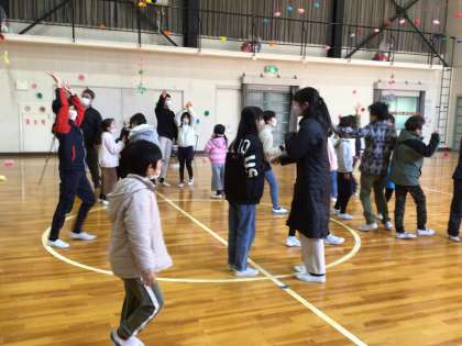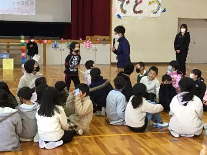 「よくきけ あつまれゲーム」は、箱の中に入っているカードを引き、そのお題のグループで集まるというものです。カードを引くのは6年生。「好きな鳥」「好きな色」「名前の文字数」など、お題に合わせて声をかけ合い、仲間同士集まっていきました。集まったあと、「このグループの好きな鳥はなんですか」などと、インタビューをしていました。
