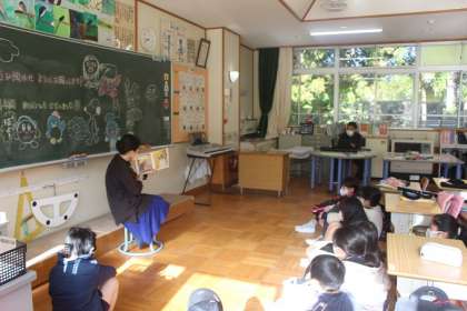 今日の中学年の読み聞かせは、「オペラハウスのなかまたち」です。読み聞かせの途中から、担任が「魔笛」のアリアの一節をキーボードで演奏し、お話と音楽のコラボレーションが始まりました。子どもたちは、「聴いたことある!」と、うれしそうでした。