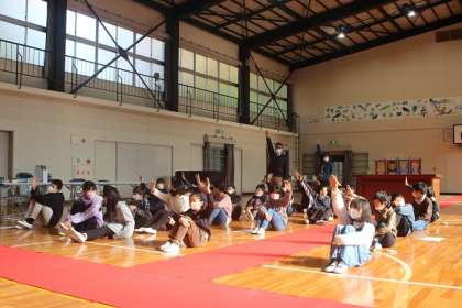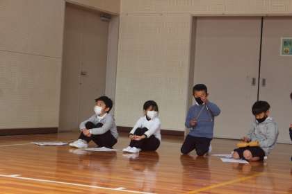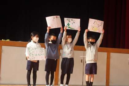 いきいき集会で、1・2年生がクイズをしました。3択クイズです。「ジブリパークで見つけた鳥はなんでしょう」「音楽の授業で見つけた虫は何でしょう」など、楽しい問題がいっぱいでした。