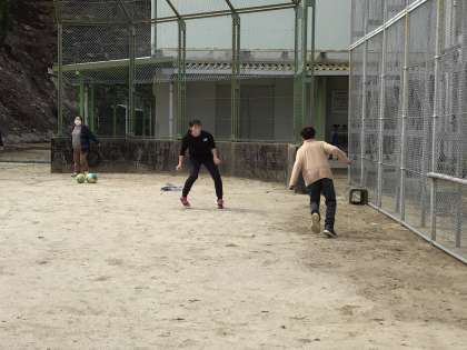 先生対子どもたちの「どろけい」。あまりにも先生たちの警察が負けるので、最後は少しルールを変更して、6年生も警察に加わりました。そして宝のボールは3つ。警察の陣地も、宝を守りやすいように、バックネット前にしてもらいました。おかげで、やっと警察が勝つことができました。