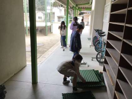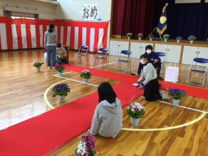 体育館の準備では、赤絨毯をきれいにしたり、テラスを掃いたりしました。