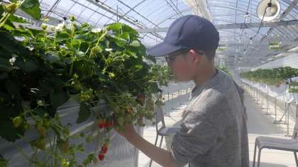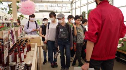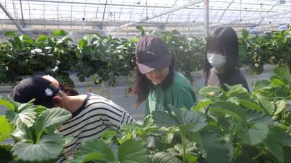 校外学習の二つ目の見学先は、ストロベリーパークみふねです。商品の説明を聞いたり、いちご狩りをしたりしました。