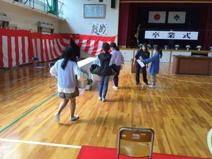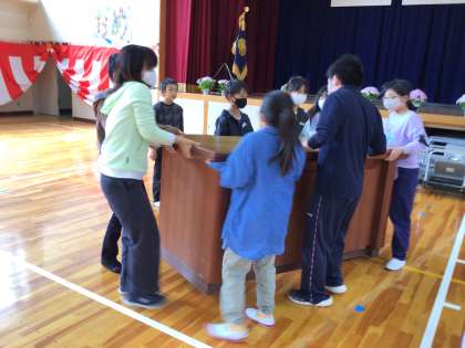 掃除の後は、会場づくりをしました。赤じゅうたんを敷いたり、演台を運んだり、友達と協力して頑張りました。花を置くときは、色のバランスを考え、きれいに見えるように工夫していました。