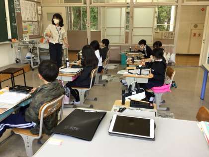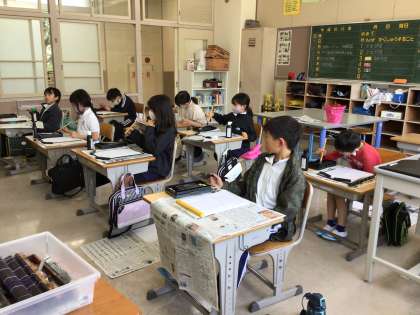 3年生は、初めての習字の授業でした。道具の使い方や筆の使い方を、4年生が3年生に教えていました。優しいお兄さん、お姉さんです。その後、横棒を書く練習をしました。