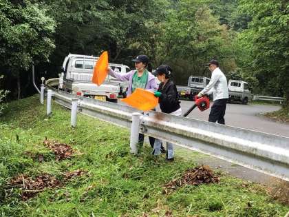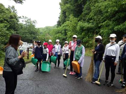 二畳ヶ滝に出発するころには雨も上がり、5・6年の子どもたちも参加して、クリーン活動を行いました。先生から仕事の内容や注意事項を聞いて、それぞれの分担場所に行き、作業をしました。