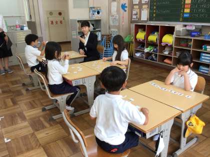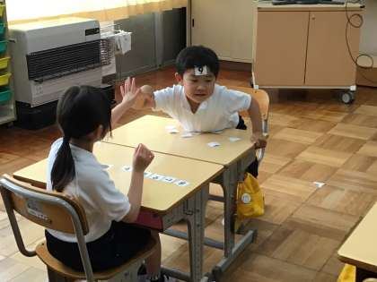 「10の分け方マスターになろう」と、10はいくつといくつか、「10づくりゲーム」をしながら、学習しました。ペアになって、一人がふせてある数字カードの中から1枚とり、もう一人に見せます。カードを見せられた子は、表になっているカードの中から、その数字と合わせて10になるカードを選んでとります。2つのカードの数字を合わせて、見事10になったら、2人でハイタッチ!とても嬉しそうでした。