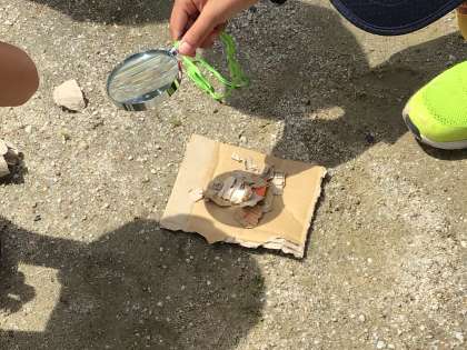 「太陽の光」の学習で、虫めがねで日光を集めるとどのようになるか調べました。段ボールに、虫めがねで集めた光をあて、子どもたちはその様子をじっと観察していました。途中、雲が出てきて太陽を隠してしまう場面がありましたが、再び太陽の光がさすと、今がチャンスとばかりに、一生懸命光を集めていました。段ボールがこげるほど光を集めた子もいました。
