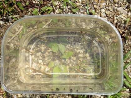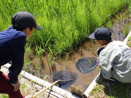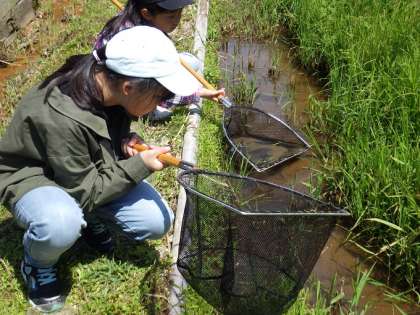 天気にもめぐまれ、たもを持って、メダカだと思うものをさがしました。