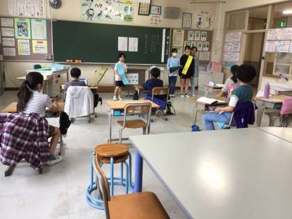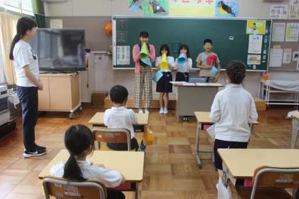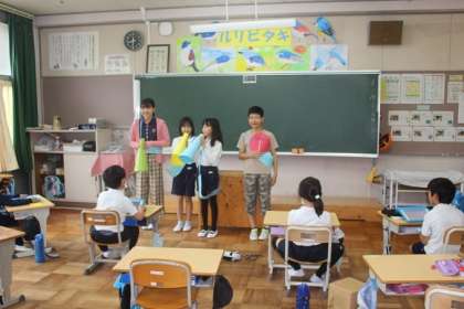 滝脇小学校の一日が元気なあいさつで始まるように、朝、保健委員が各教室をまわり、あいさつ運動をしています。「あいさつ軍団」と書かれたたすきを身につけ、手作りのメガホンを持ち、「おはようございます」とあいさつをしてまわっています。滝脇小学校を、気持ちのよいあいさついっぱいの学校にしていきたいですね。